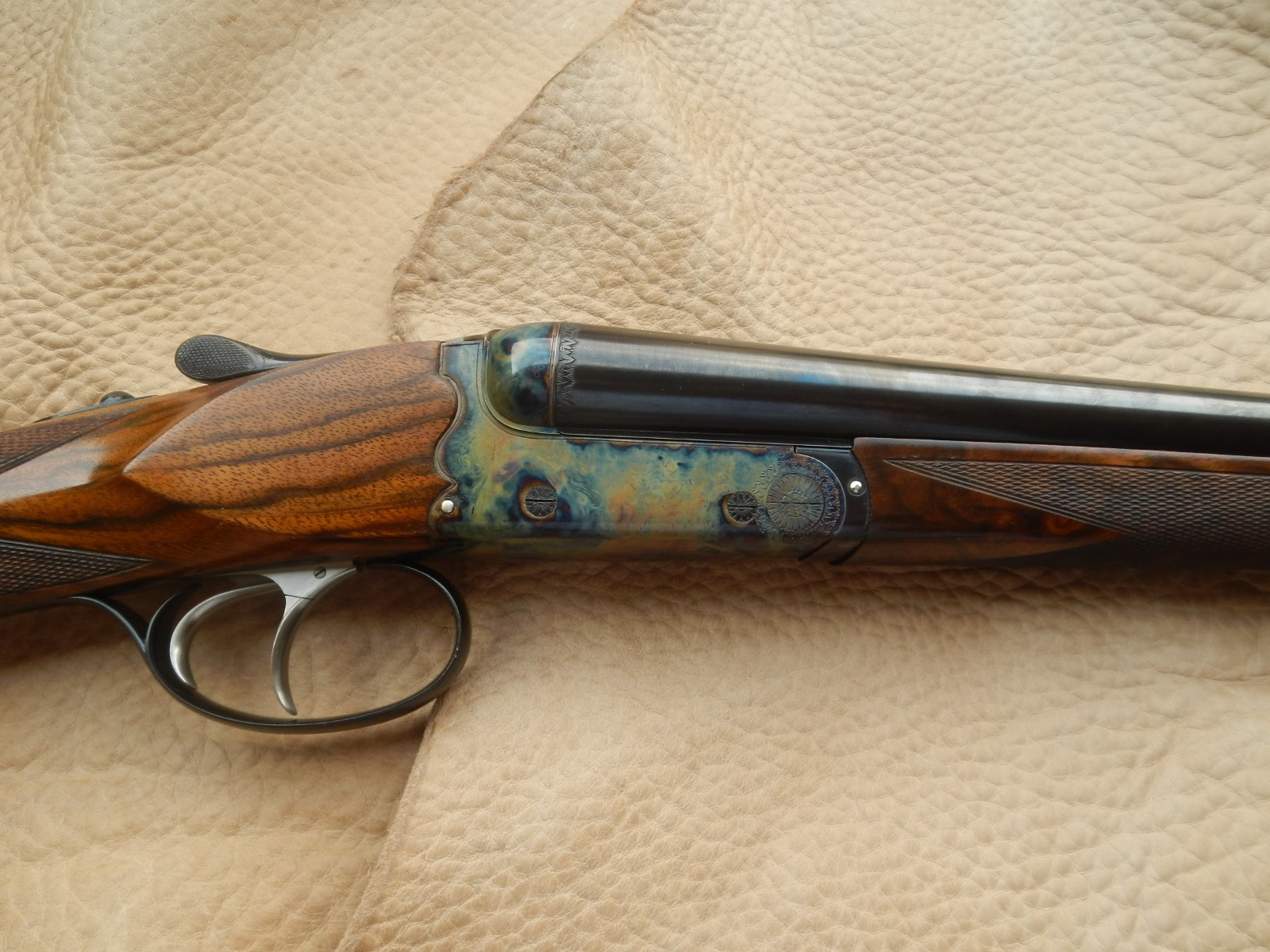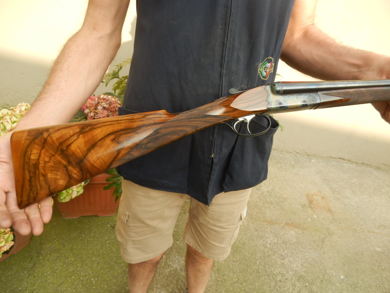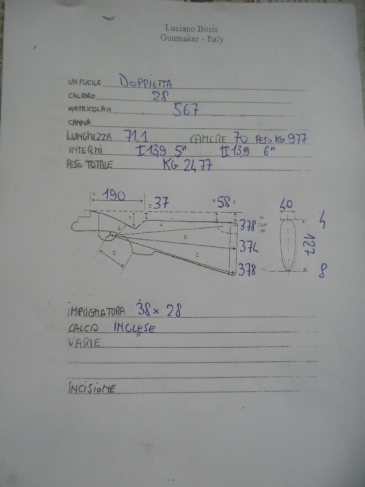 Country side by side in 28 bore. Gunmaker Luciano Bosis. Demibloc barrels 71 cm. Bored 13.90 choked 5/10 and 6/10. Double trigger, automatic ejectors. Total gun weight 2.477 kilos. Engraved by Parravicini and case colored in Germany by Mr Schilling. New gun, never shot.