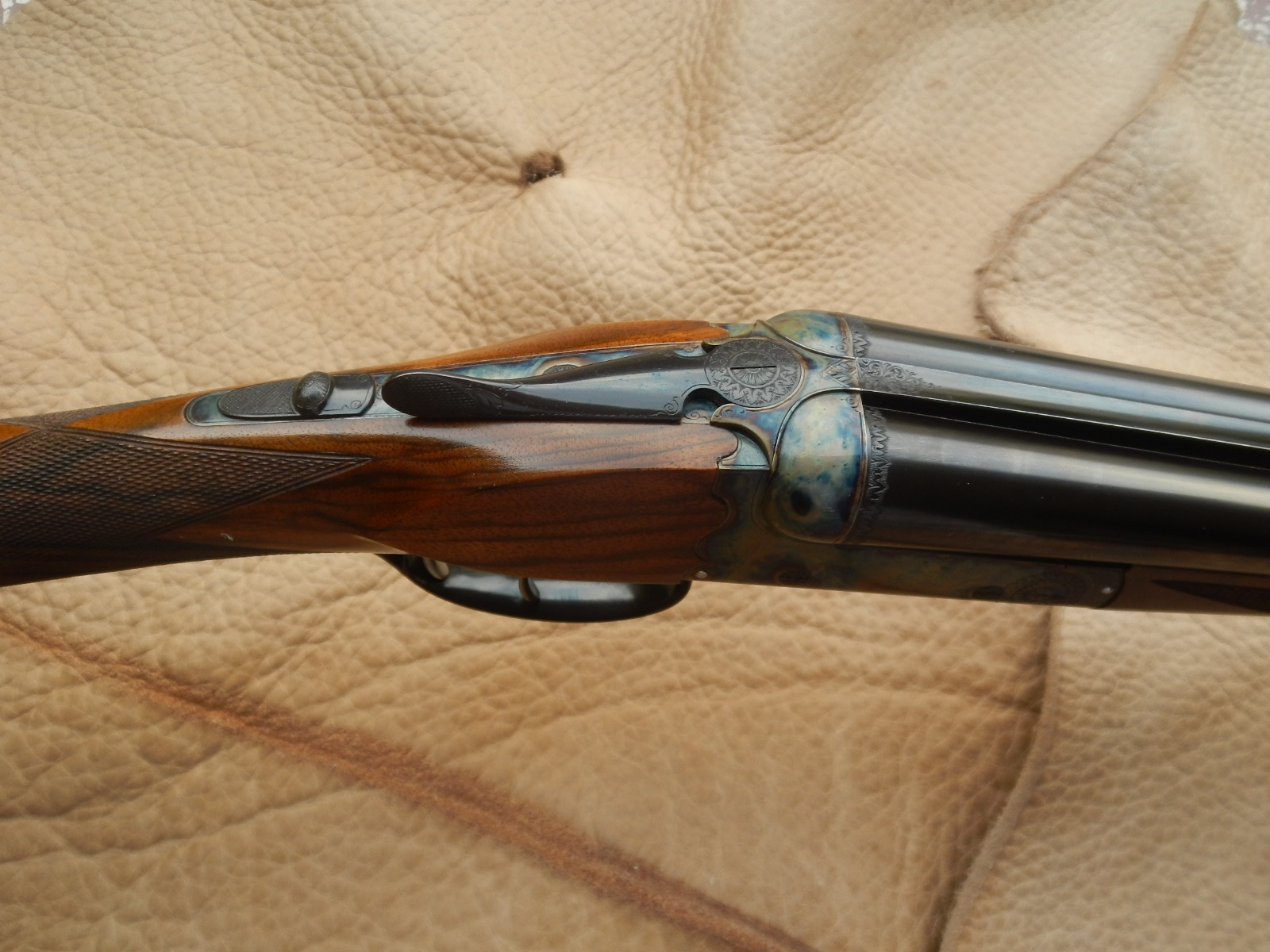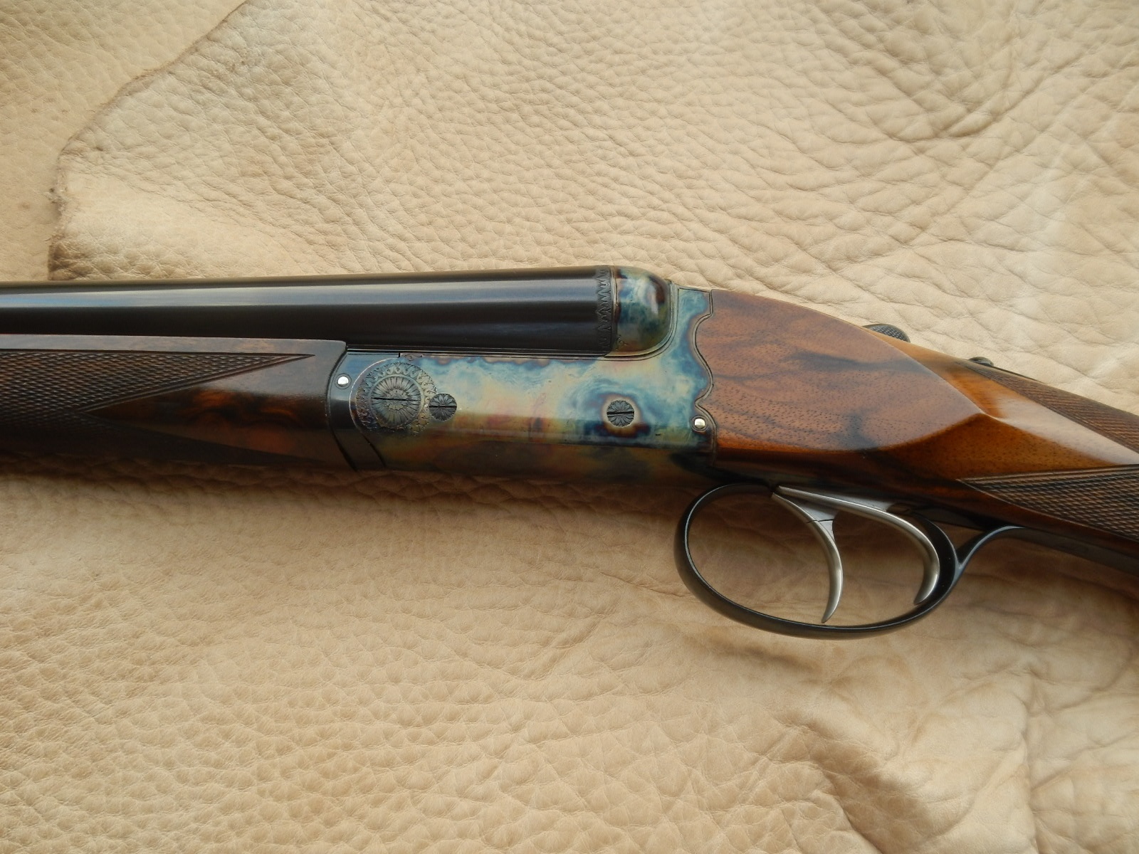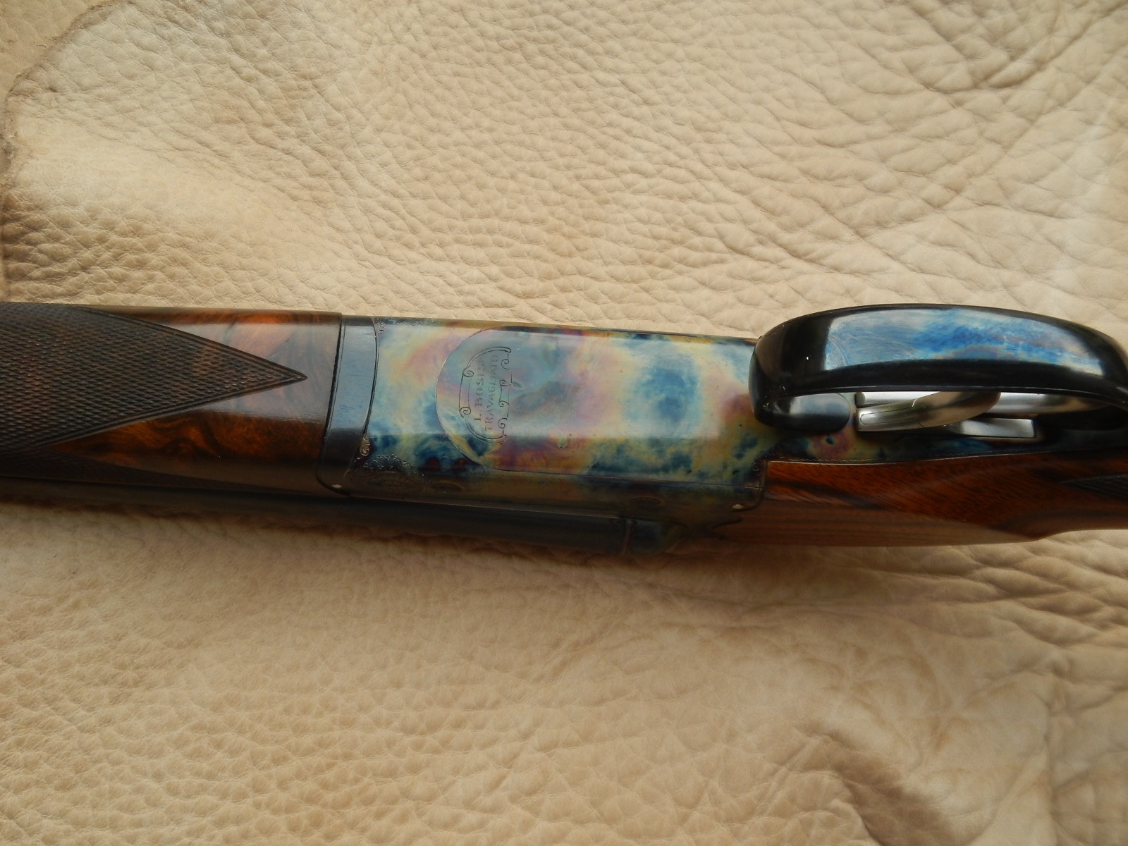Country side by side in 28 bore. Gunmaker Luciano Bosis. Demibloc barrels 71 cm. Bored 13.90 choked 5/10 and 6/10. Double trigger, automatic ejectors. Total gun weight 2.477 kilos. Engraved by Parravicini and case colored in Germany by Mr Schilling. New gun, never shot.